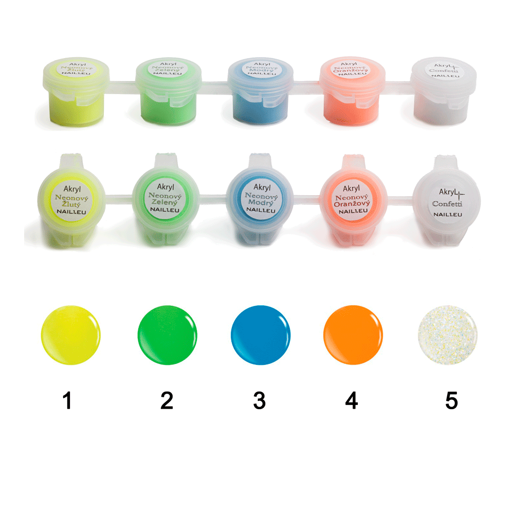 4 neonových akrylů s velmi jemnou zrnitostí a 1 glitterového akrylu nejvyšší kvality.