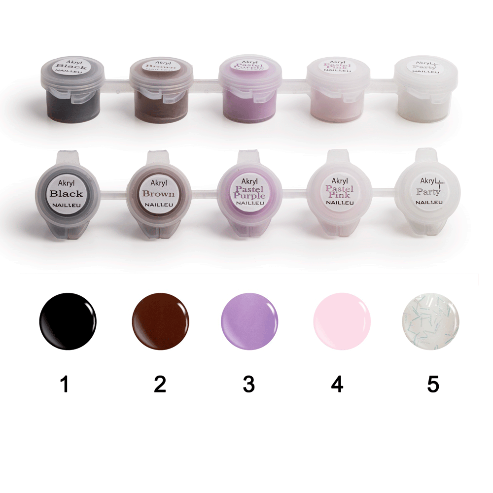 4 barevných s velmi jemnou zrnitostí a 1 glitterového akrylu nejvyšší kvality.