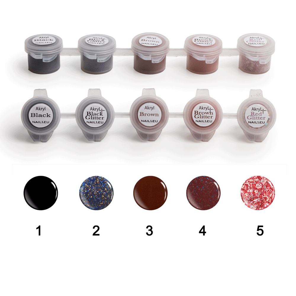 2 barevných akrylu s velmi jemnou zrnitostí a 3 glitterových barevných akrylu nejvyšší kvality.