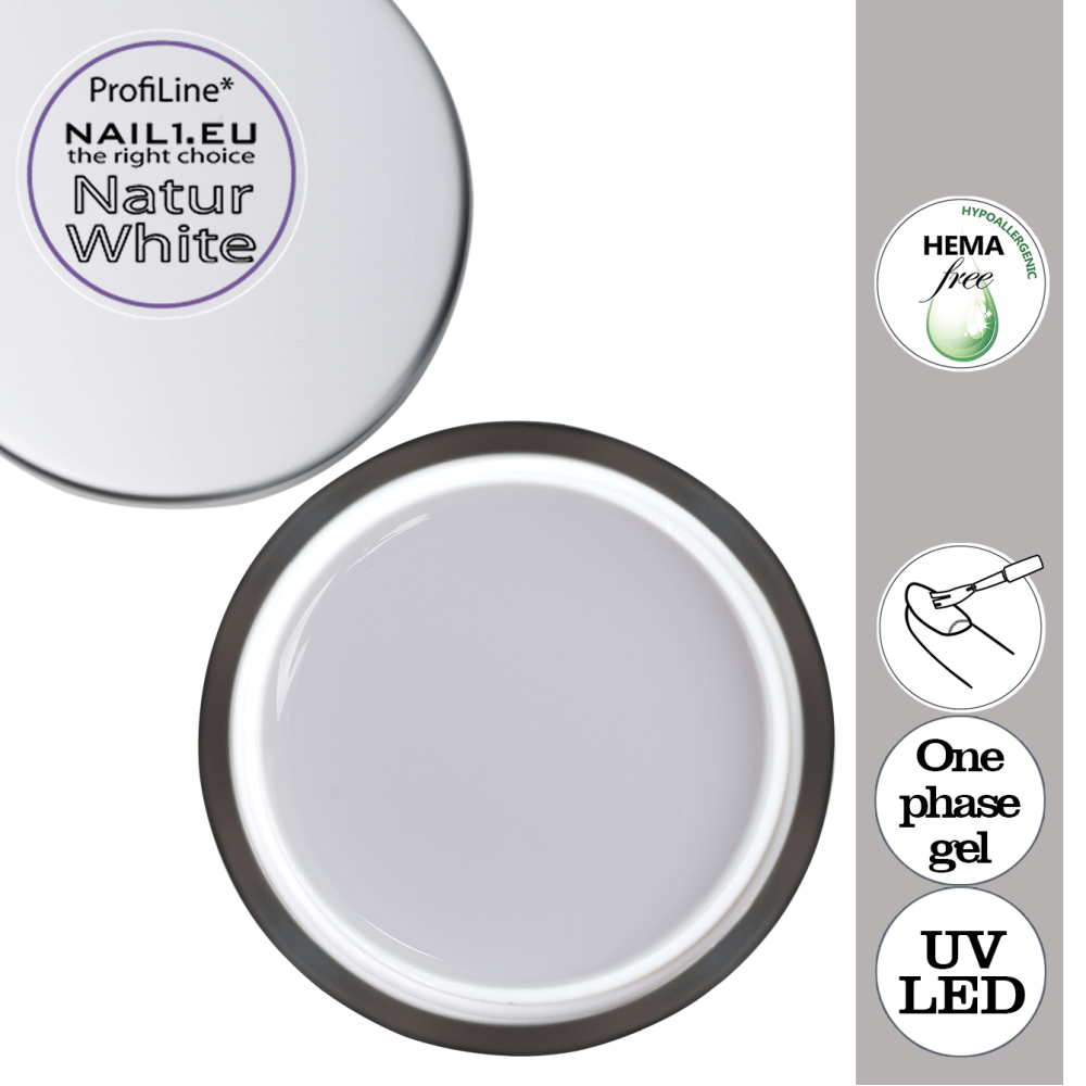 ProfiLine* Natur White UV Gel středně husté konzistence. Mlečný jednofázový gel. Odstín - Bilý, mlečný, lehce pruhledný (half transparent color) - přírodní barva nehtů.