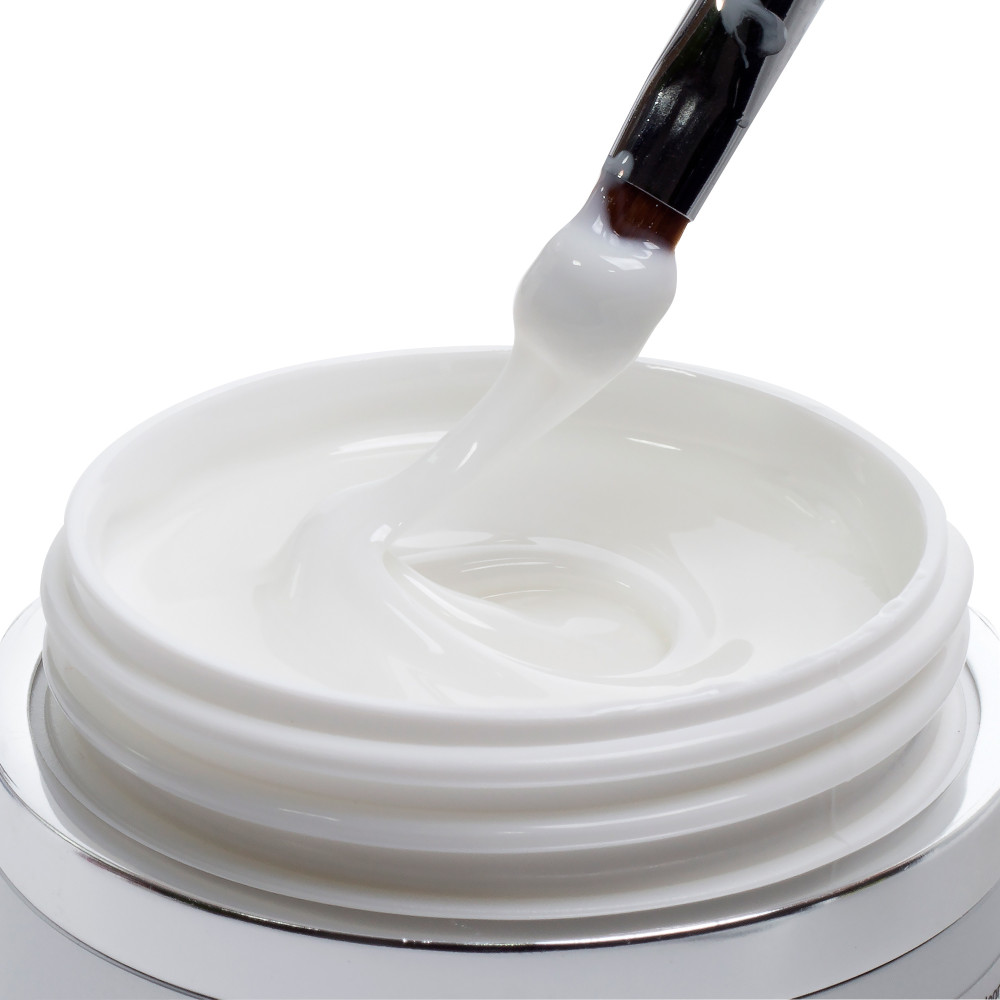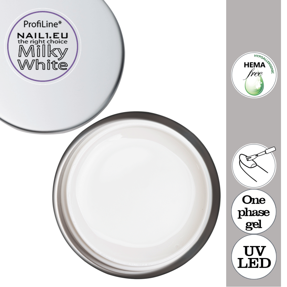 ProfiLine* Milky White UV Gel středně husté konzistence. Mlečný jednofázový gel. Odstín - Bilý, mlečný, lehce pruhledný - přírodní barvy nehtů.