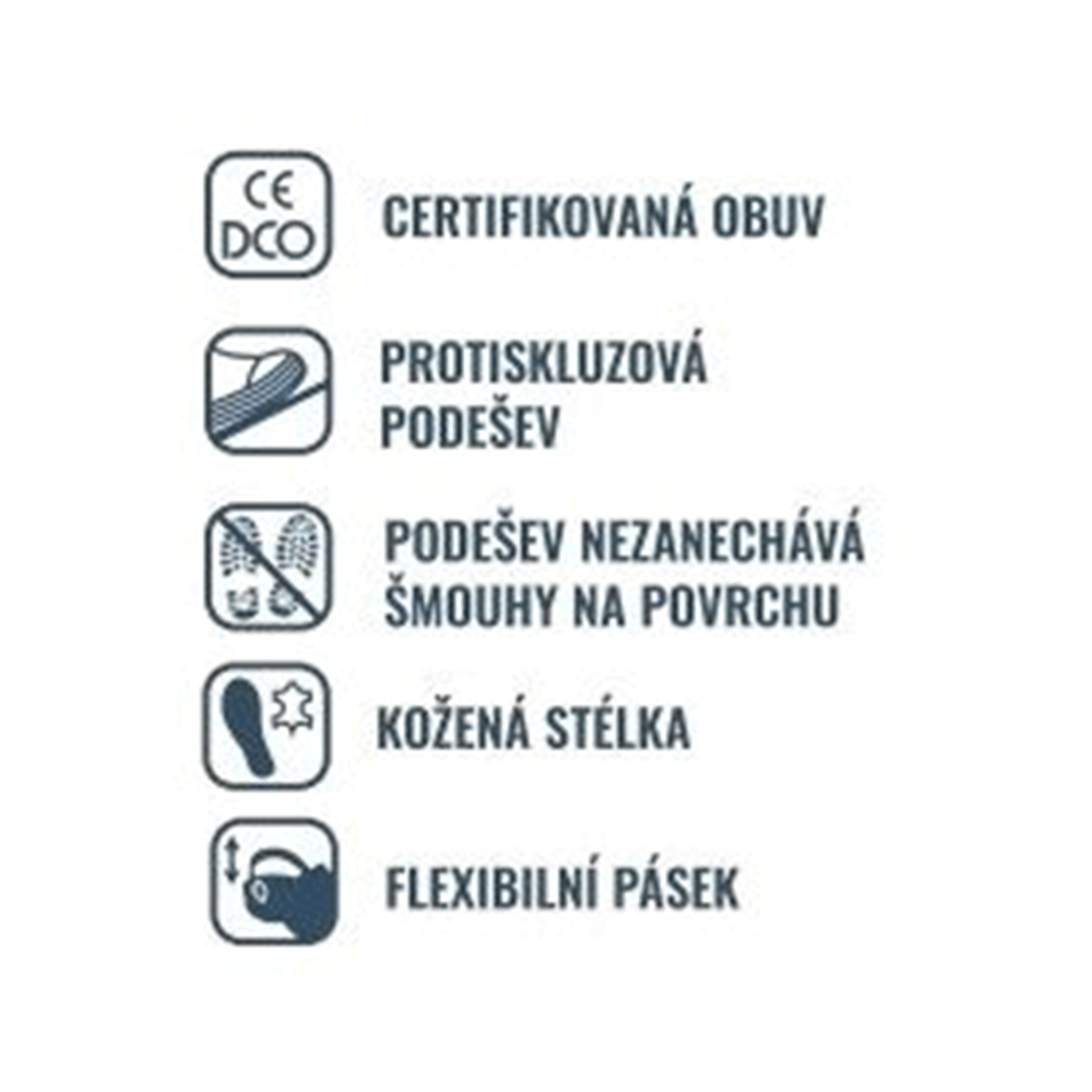 Kožená stélka, prodyšný materiál, certifikovaná obuv, flexibilní pásek, protiskluzová podešev.