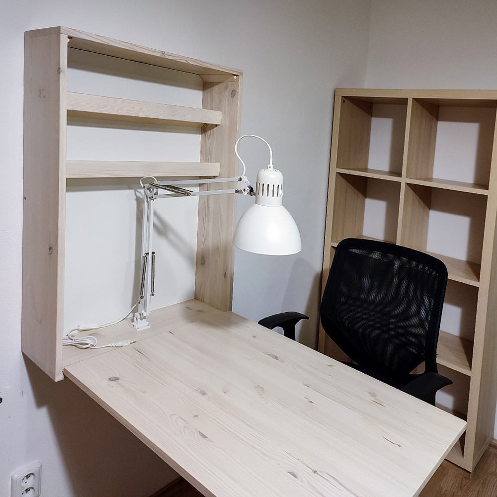 Stul je vyřešen jako nástěnná police se sklápěcí deskou kterou pak prakticky zvednete. Konstrukce z masivu umožňuje větší zátěž na desku, než podobné levnější stoly z laminátu. Přejemný na omak a snadný na úklid, tento stul umožní Vám mít vlastní prostor na tvoření.