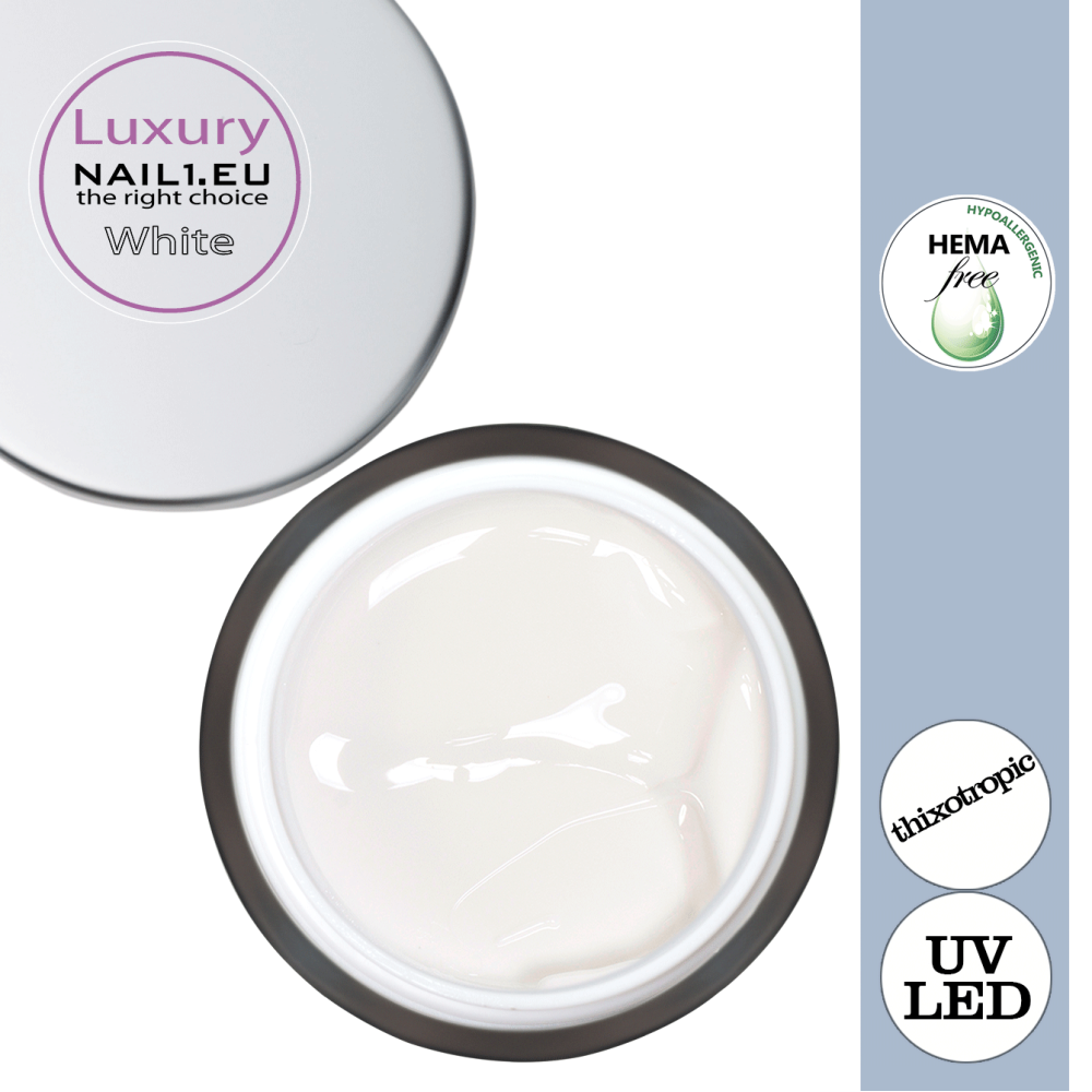 Luxury UV/LED Gel White je exkluzivní modelovací tixotropní gel s pevnou texturou, která není tekutá. Díky své konzistence s ním se velmi snadno pracuje na nehtech jakékoliv délky a tvaru.
